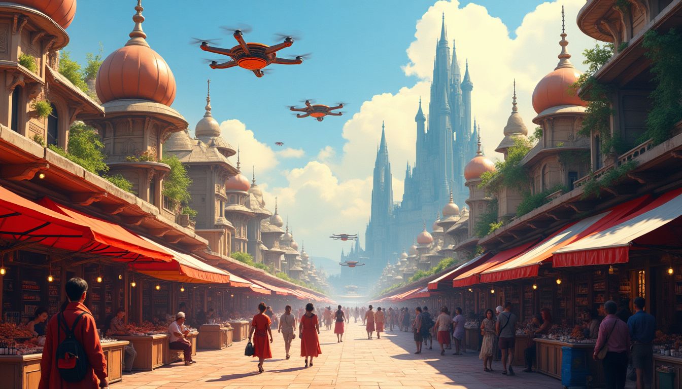 At his side walked Mira, a technician and drone specialist, whose flowing, iridescent garments hung loosely on her slight frame, each color capturing the light in shimmering displays. Her curly hair cascaded around her shoulders, adorned with bits of tech jewelry that whispered of her prowess in engineering. Together, they formed a formidable duo, their interests intertwined through both ambition and affection. Their conversations, often a dance of wit and ambition, sparked like firecrackers against the backdrop of the city's hustle.