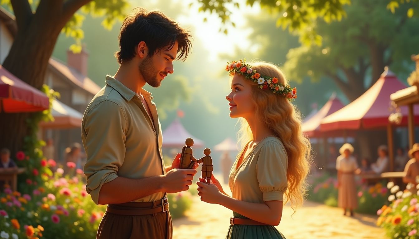 As the fair approached, Edwin devised a plan. He spent countless hours crafting a stunning wooden figure of a gallant knight, intending to present it to Clara amidst the festivities, hoping it would symbolize his unwavering dedication. The day of the fair arrived, buzzing with excitement and the enchanting aroma of roasted chestnuts and honeyed confections wafting through the air. The village square was alive with vibrant colors, laughter, and the enticing sounds of musicians tuning their instruments.
