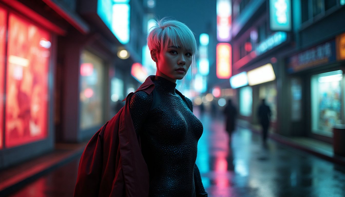 Without missing a step, Kaida slipped into a narrow alleyway flanked by holographic advertisements that cast shifting shadows on the rain-slick pavement. The cacophony of city life dimmed as she approached her target. Each footfall brought memories flooding back—a flash of her brother's face, now locked away in a MetaDyn facility for daring to speak out against the corporation.