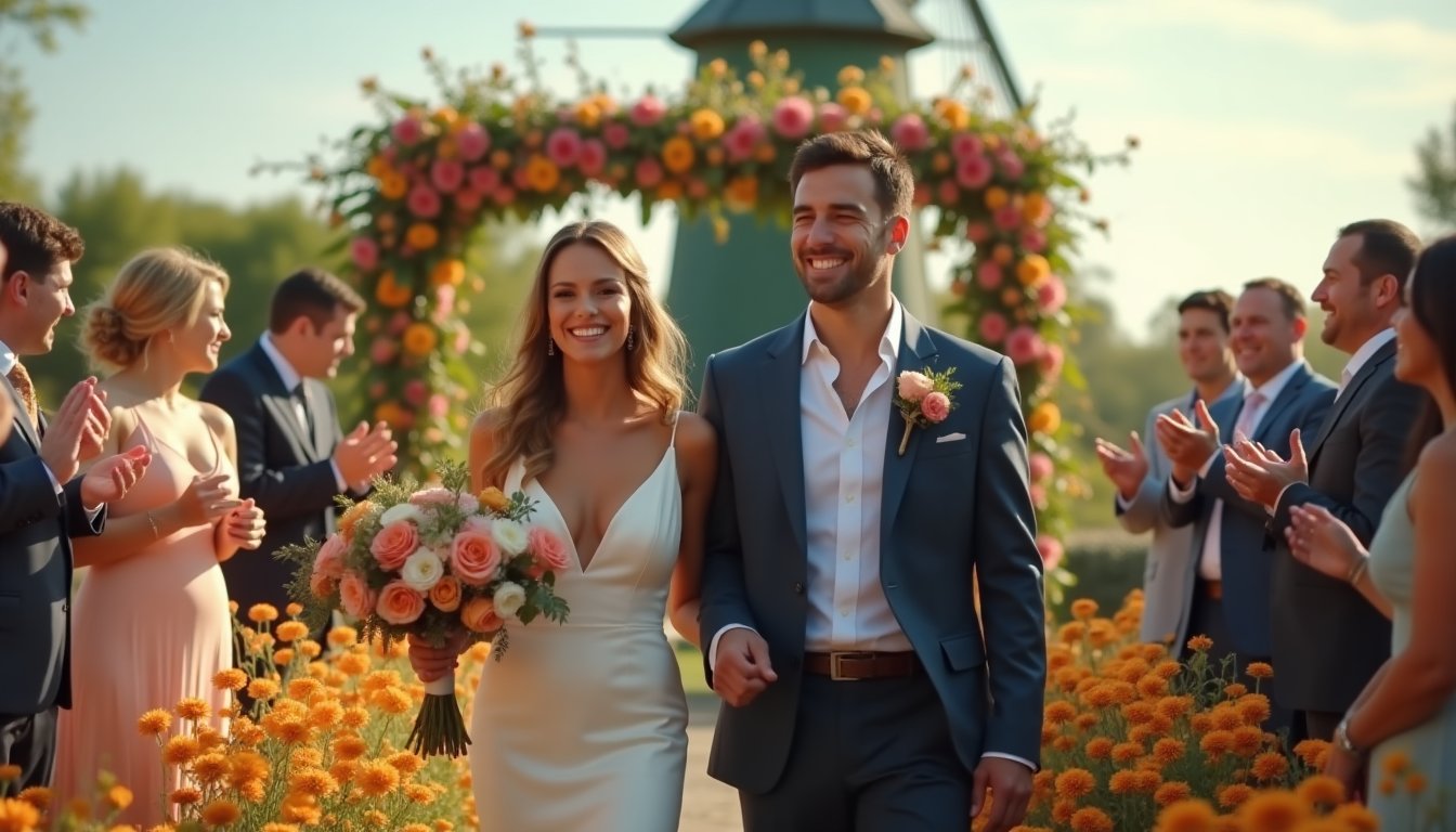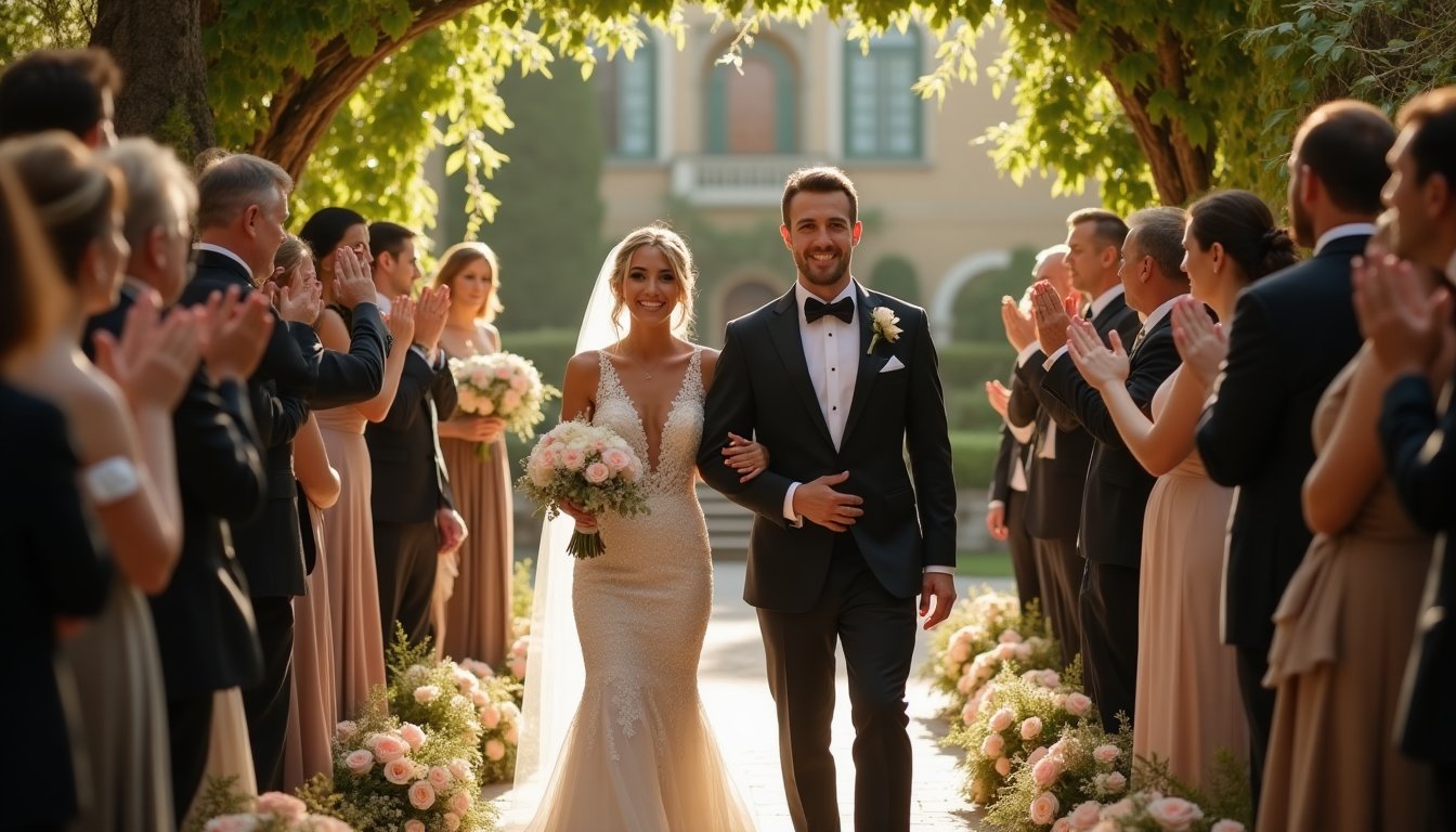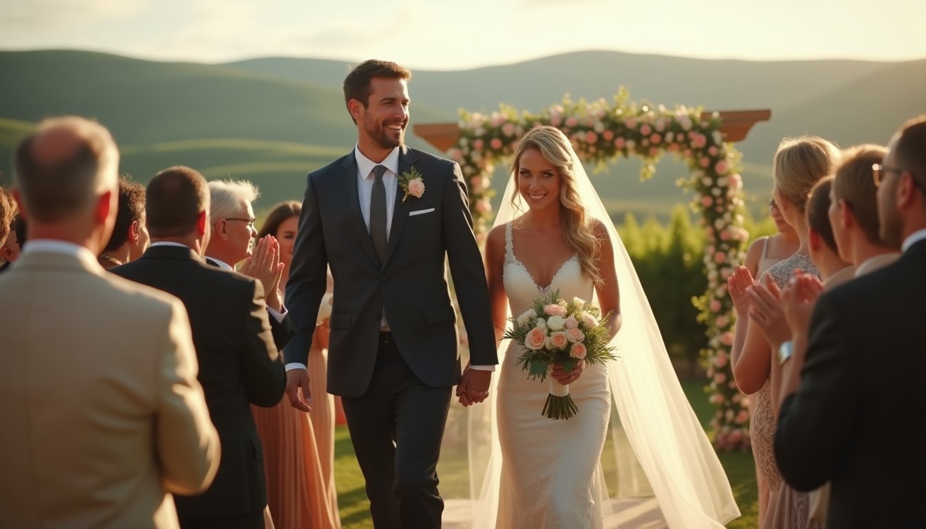 Vibrant Love: Newlywed Couple Shines as They Walk Aisle in Garden
