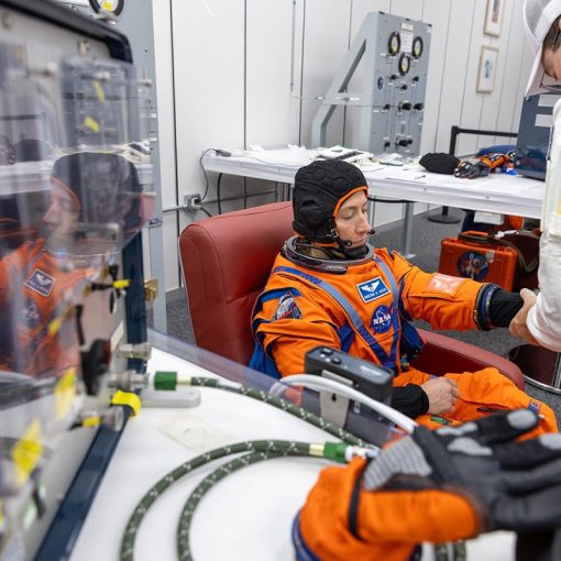 NASA astronaut Christina Koch is illuminated by a screen inside the darkened Orion spacecraft on the third day of the agency’s Artemis II mission. To the right of the image’s center, CSA (Canadian Space Agency) astronaut Jeremy Hansen is seen…