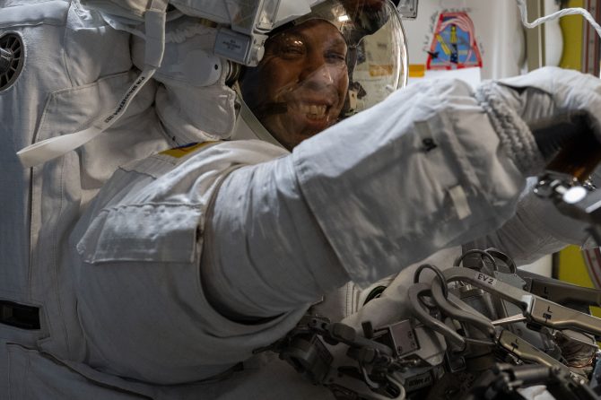 NASA astronaut and Expedition 74 crew member Chris Williams smiles for the camera during a spacesuit fit verification inside the International Space Station’s Quest airlock.