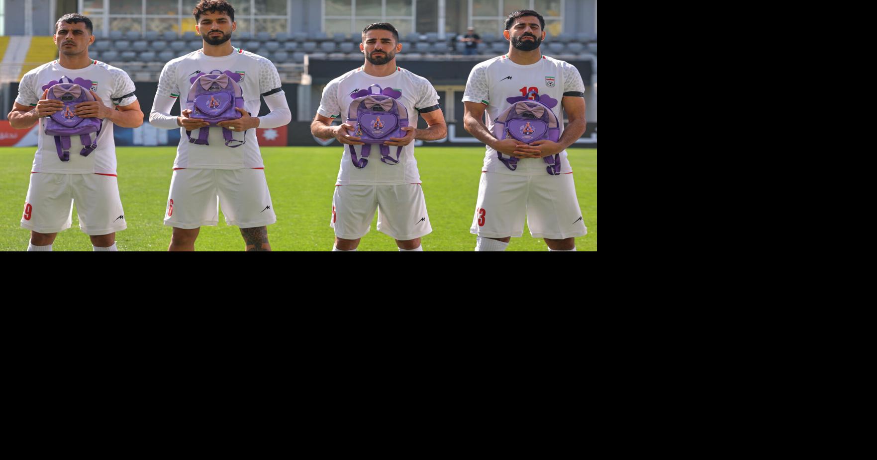 Iran’s players sing national anthem holding school bags, symbolizing children allegedly killed in a U.S. strike on a school in Minab, before a friendly soccer match between Iran and Nigeria,